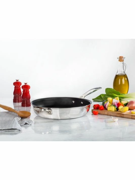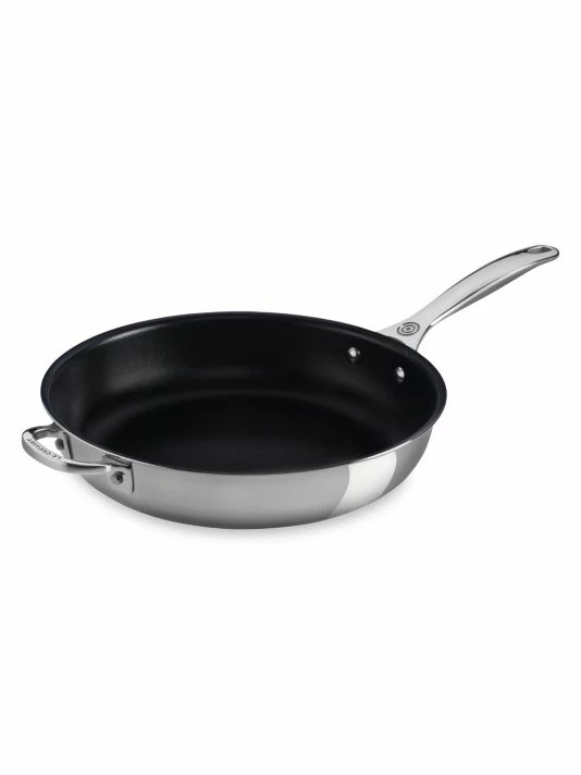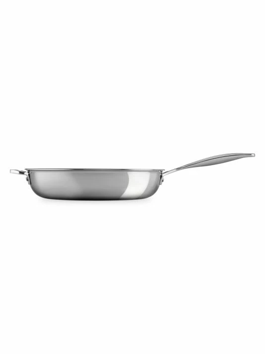 This stainless steel deep fry pan with a triple-layer construction is complete with a full base-to-rim aluminum core for superior heat distribution, helper handles for comfortable movement on the stovetop, and a lightweight titanium-infused stainless steel exterior that resists corrosion at higher temperatures.