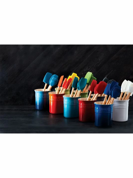 Stir, scoop, spread or scrape β Le Creuset’s Craft Series utensils are made for everyday use and long-lasting durability. This five-piece set of silicone utensils includes the full assortment of our Craft Series range. Itβs perfect for outfitting a new kitchen or complementing a Le Creuset collection. The stoneware crock keeps tools organized. Flexible silicone tips scrape bowls clean. Removable silicone heads are dishwasher safe and wonβt scratch cookware, even nonstick. Smooth wood handles provide a comfortable grip. Utensils can also be hung for storage or simply pop them in the crock.