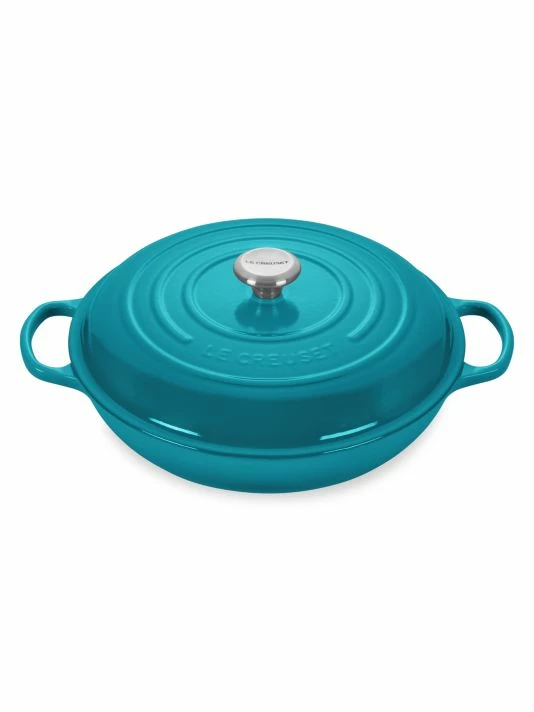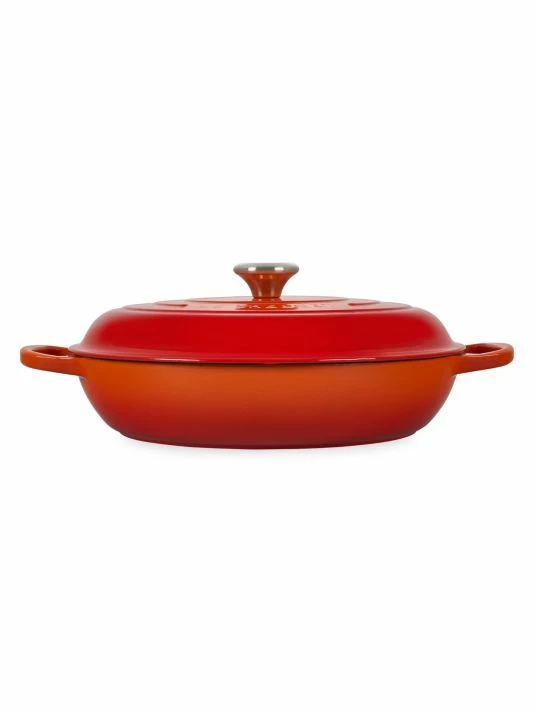 Enameled cast iron braiser transforms tough cuts of meat and hearty vegetables into tender, flavorful dishes. Food is first seared over high heat, then finished slowly in a flavorful liquid. The wide base of the braiser allows ingredients to be placed in a single layer for proper searing; once liquid is added, the domed lid continuously circulates steam to lock in moisture and flavor.