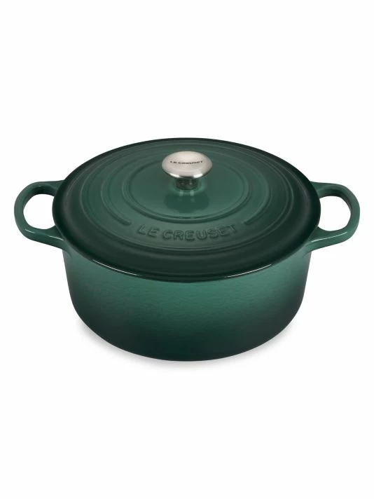 Signature round Dutch oven. Cast iron works with all heat sources and is dishwasher safe. Oven safe up to 500 degrees.