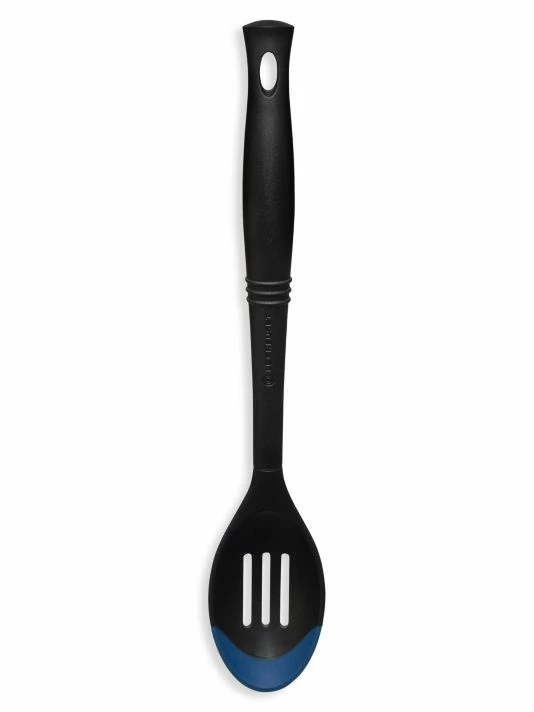 This slotted spoon’s dual-material construction offers flexibility without sacrificing strength. Its elliptical-shape handle with grip rings increases comfort and control.