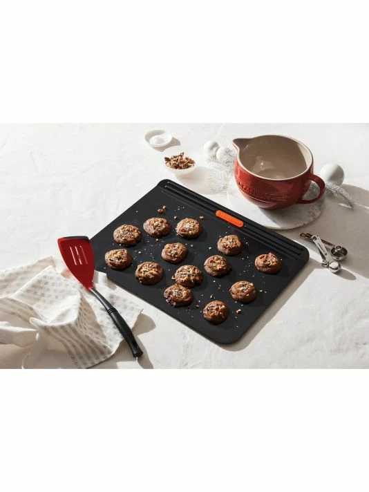 This slotted turner’s dual-material construction offers flexibility without sacrificing strength. Its elliptical-shape handle with grip rings increases comfort and control.