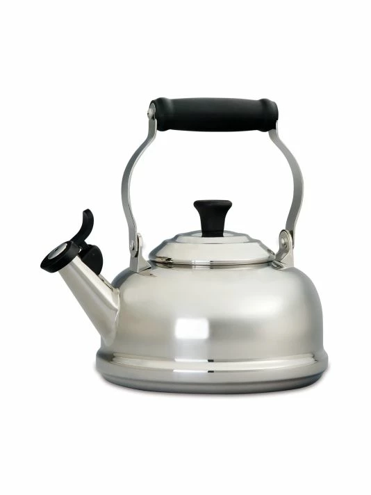 This stainless steel kettle featuring a wide base for quick heating adds a touch of contemporary style to the stovetop with its lustrous finish and timeless silhouette.