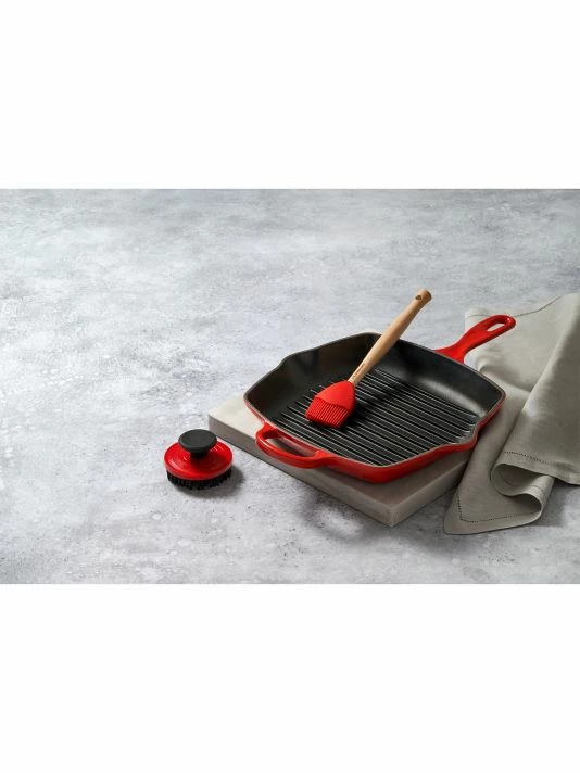 The grill pan brush has tough, durable bristles that make quick work of removing stuck-on foods from cast iron cooking surfaces. It is especially helpful when cleaning between the ridges of cast iron grill pans. The premium-quality silicone head is heat-resistant up to 482ΒΊf/250ΒΊc, stain-resistant, non-abrasive and easily removable.