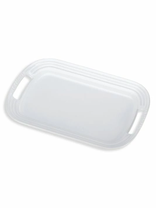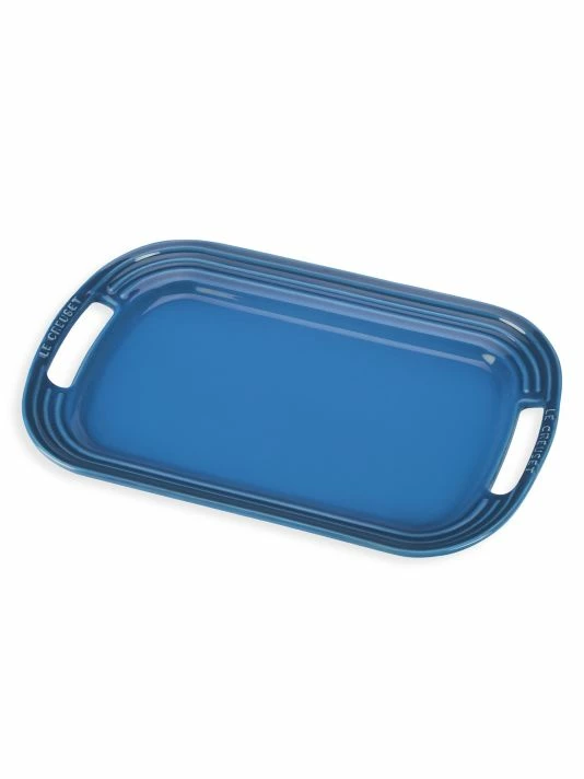 The stoneware serving platter has ridged edges that slope upward to contain food, while two wide handles are cut into each end to ensure a steady grip when carrying heavier foods like roasts or poultry to the table. Dense stoneware blocks moisture absorption to prevent cracking, crazing and rippling. Impermeable exterior enamel resists stains and scratches from metal utensils. Nearly-nonstick glazed interior easily releases foods for quick cleanup.