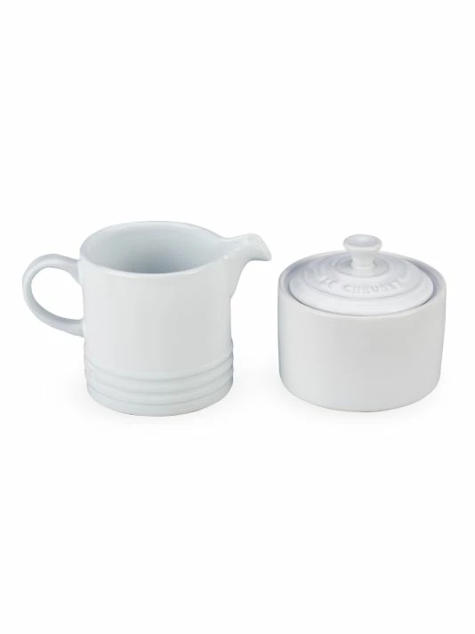 Enjoy coffee in style with this bold Le Creuset cream and sugar set. The cream pitcher’s spout ensures drip-free pouring and the lidded sugar jar keeps sugar protected. Dense stoneware prevents moisture and odor from entering or escaping, and a tough, enamel finish resists chipping, scratching, and staining. Safe for use in the microwave, freezer, refrigerator, dishwasher, and broiler.