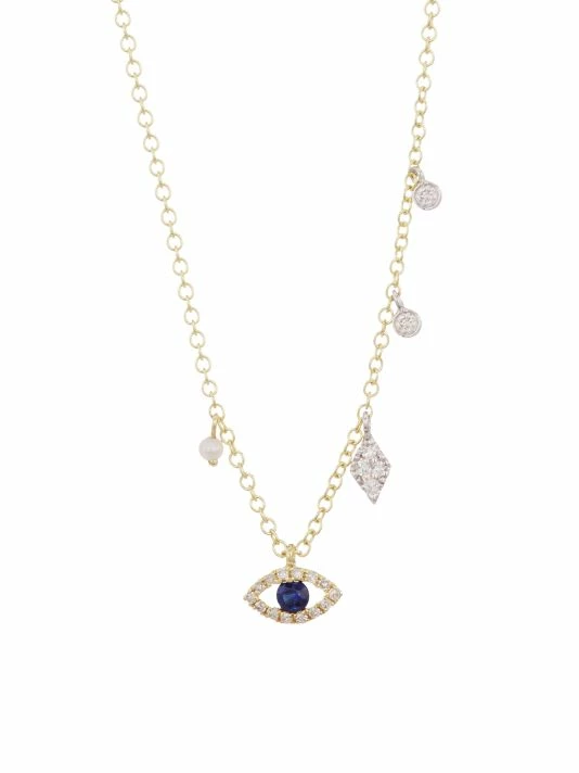 Delicate gold chain necklace with a diamond and sapphire evil eye charm.