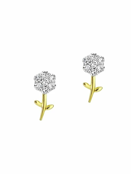 PavΓ© diamond flower earrings with a contrast gold stem.