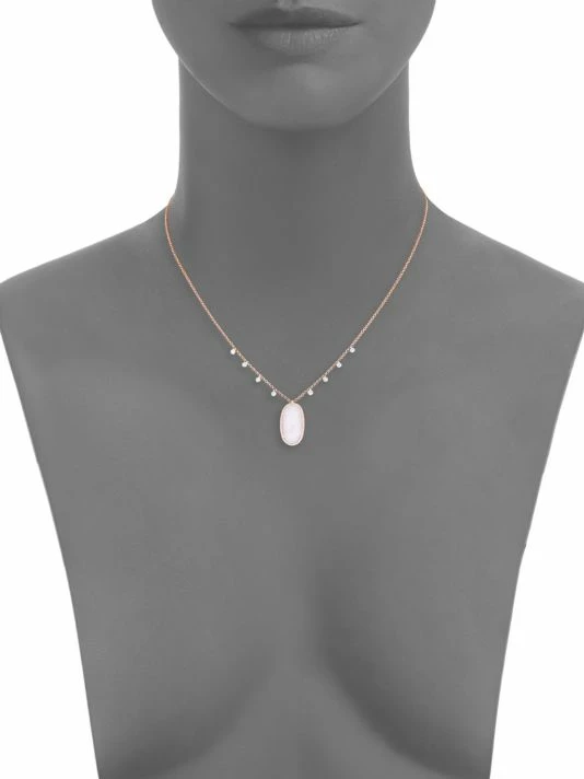 Stunning pink opal pendant and gleaming diamonds adorn this rose gold necklace.