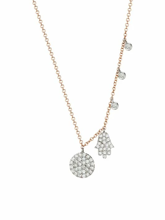 Decadent rose gold necklace with diamond-embellished charms exude elegance.