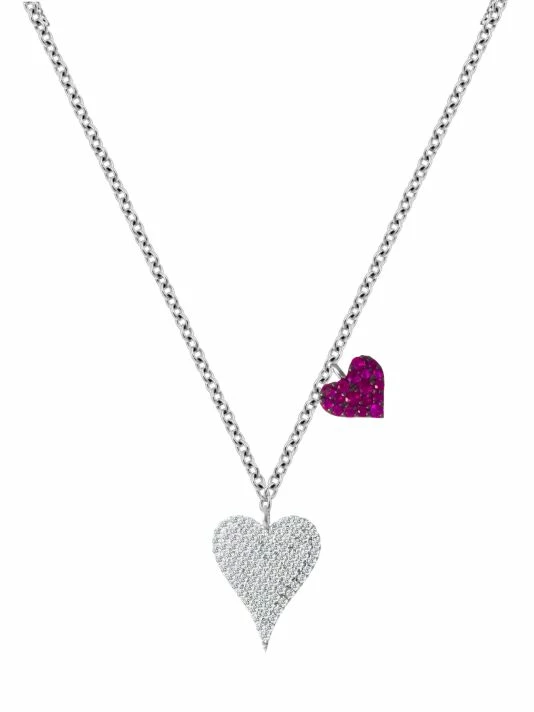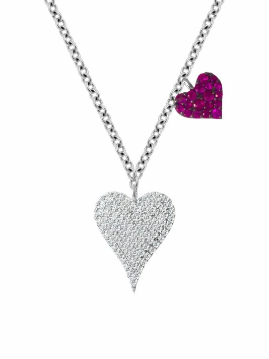 A delicate white gold chain showcases a pair of heart pendants one diamond encrusted the other encrusted with bright ruby.