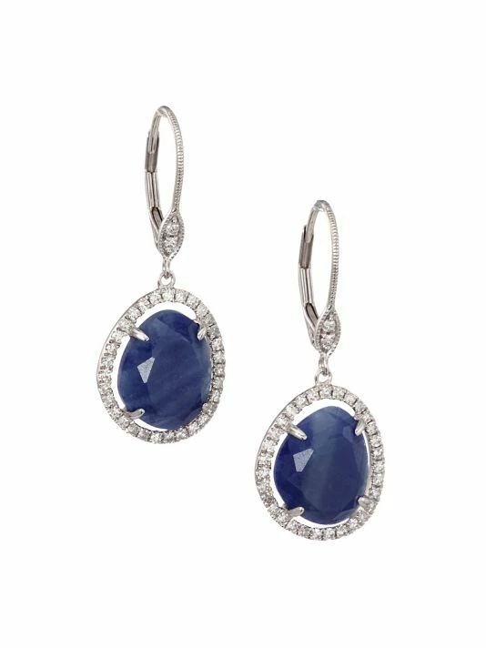 A diamond pavΓ© halo surrounds faceted blue sapphires in a elegant drop earring shape.