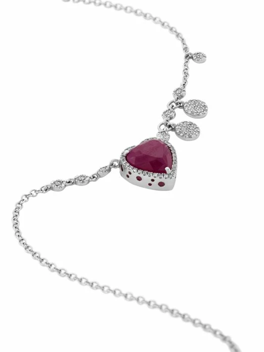 A faceted ruby heart centers this sweet pendant necklace, embellished with glittering diamonds and pavé disc charms along the delicate white gold chain.