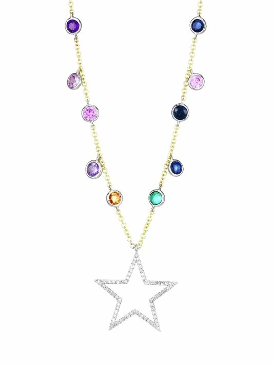 14K yellow gold chain dotted with an assortment of eye-catching stones suspends a pavรฉ-set star pendant.