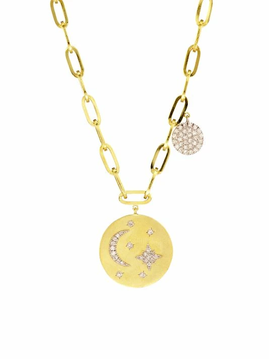 Made of 14K yellow gold, this stunning necklace features a celestial medallion detailed with diamond-encrusted moon, starburst and star motifs. Joined to a paperclip chain, this exquisite pendant is accented by a petite diamond-encrusted disk at the side.