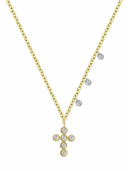 Elegant diamond cross pendant necklace accented with bezel-set diamond charms.