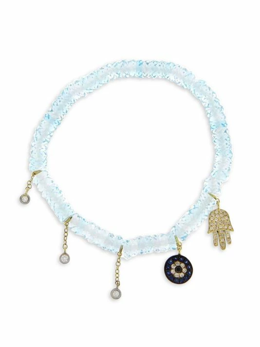 Composed of faceted blue topaz beads strung on an elastic cord, this whimsical bracelet features five dangling 14K yellow gold charms accented with sparkling white diamonds and blue sapphires.