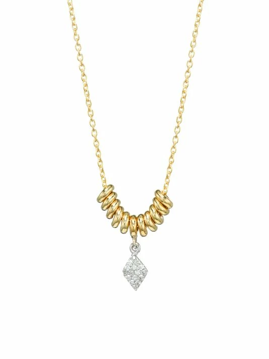 Set on a delicate yellow gold chain, this necklace is highlighted with ring charms centered with a cluster of dazzling diamonds.