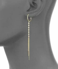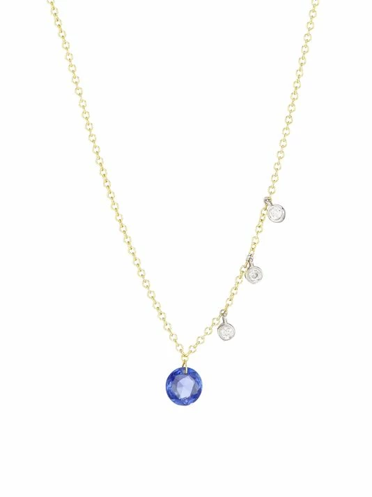 A modern asymetrical design with a stunning round sapphire pendant and dangling diamond detail,