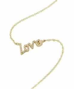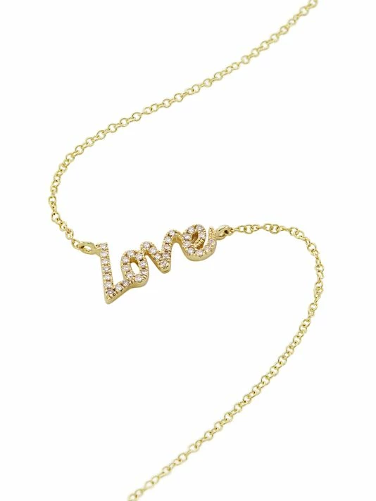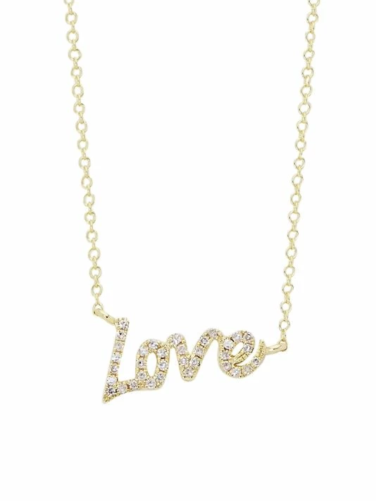 Designed as a nameplate necklace, this delicate style features a center diamond-studded love pendant.