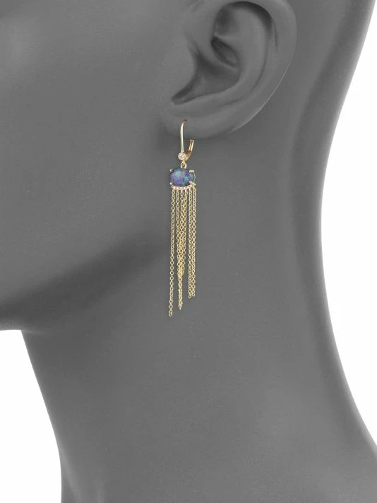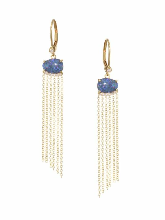 Sleek opal drop earrings set with 14K yellow gold chain and diamond accents.