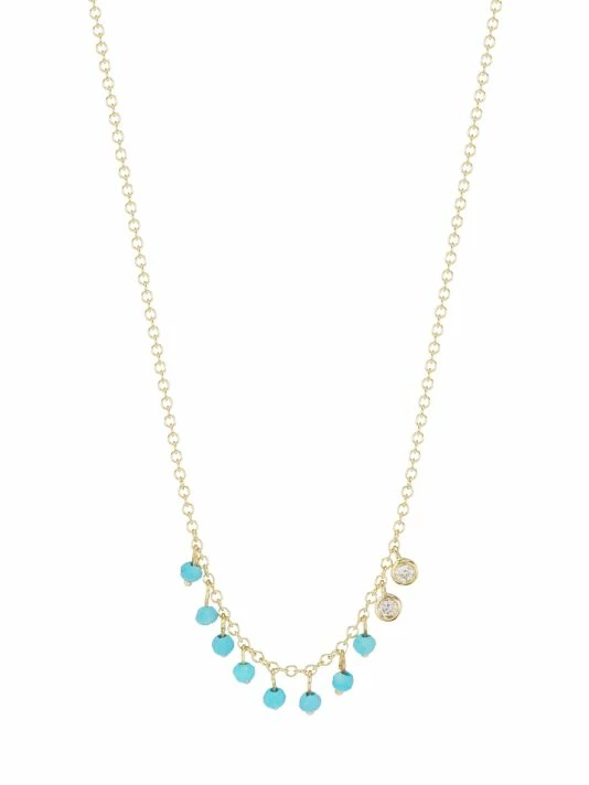 Made of 14K yellow gold, this dainty necklace is embellished with dangling faceted turquoise beads and two sparkling round bezel-set white diamonds.