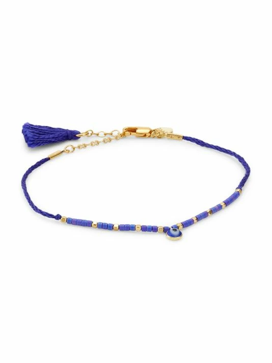 Crafted of braided fabric adorned with royal blue and goldtone beads, this elegant bracelet features a petite enameled evil eye charm