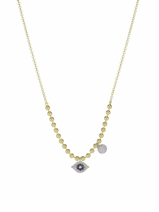 Diamonds and blue sapphires line this evil eye pendant suspended from a yellow gold ball chain necklace accented with a delicate diamond charm.